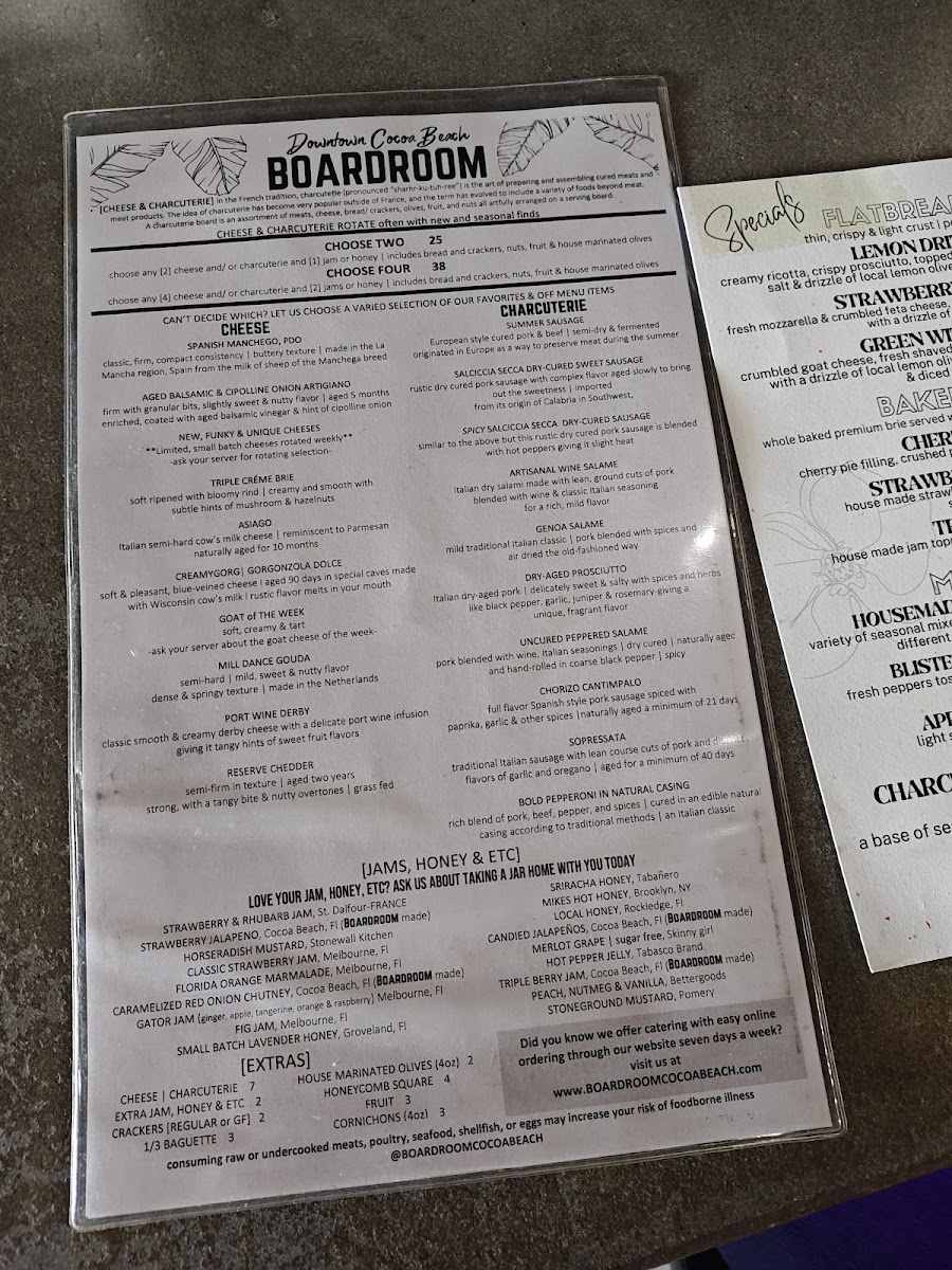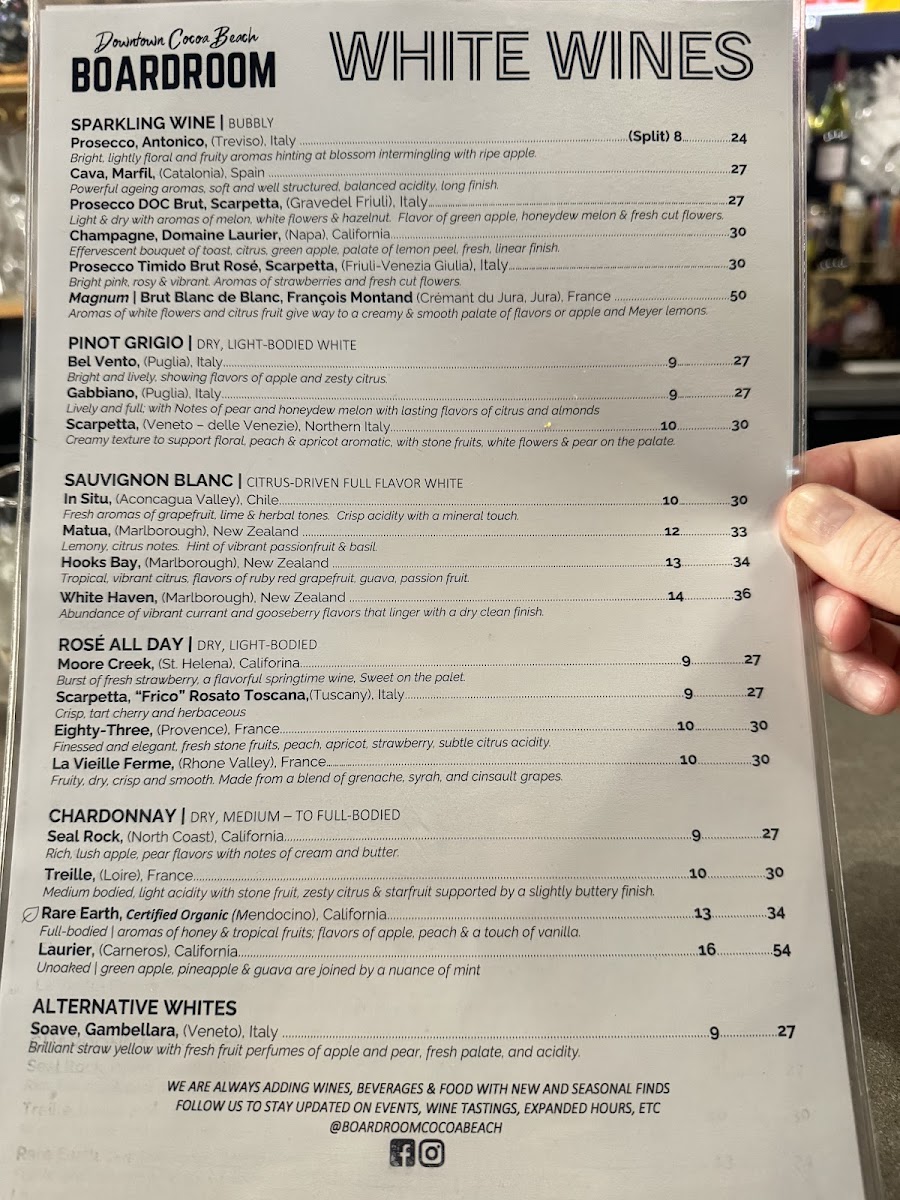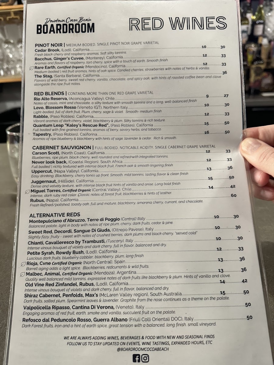 The menu at Boardroom Cocoa Beach offers a diverse and appetizing selection for any time of day, from brunch to dinner, with a variety of wines to complement your meal. For brunch, dishes like Avocado Toast ($12) and Breakfast Burrito ($14) stand out, offering fresh and flavorful starts to the day. The dinner menu takes things up a notch, featuring hearty options such as the Grilled Steak Frites ($24) and the Crispy Chicken Parmesan ($18), both of which are expertly prepared and packed with taste. Pair your meal with a selection from their Wine Menu, which features an extensive list of reds and whites, like the Pinot Grigio ($8) or the bold Cabernet Sauvignon ($10). Whether you're stopping in for a quick brunch or settling in for a relaxed evening dinner, Boardroom Cocoa Beach offers a menu filled with dishes that will satisfy any craving.